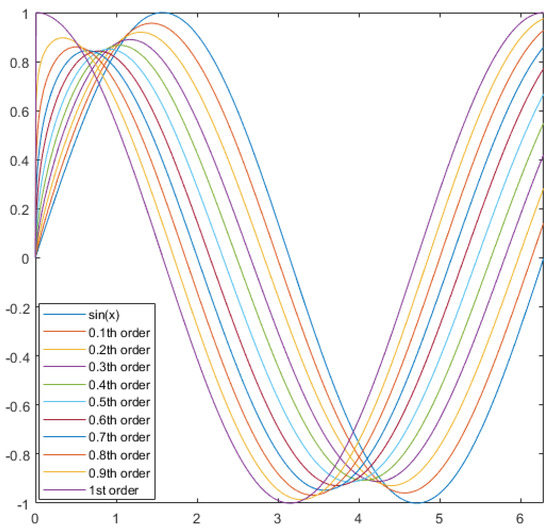 It is essential to highlight one important difference between ordinary and Grünwald–Letnikov derivatives. As one can see from Equation (6), the calculation of the Grünwald–Letnikov derivative of at x requires all function values from to x. As a consequence, Grünwald–Letnikov derivative is considered to have memory. In the literature, this property is also formulated as that Grünwald–Letnikov derivative requires non-local information [48]. As an illustration, Figure 1 depicts the fractional derivatives of the sine function with order between and .