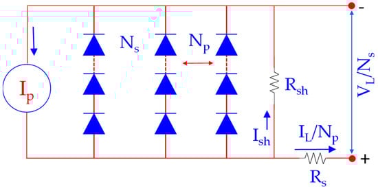 where and denote the count of solar cells interconnected in parallel and series combinations. The is the Boltzmann constant (1.3806 × 10−23 m2kgK−1s−2), is the cell/module temperature, is elementary charge, is photovoltaic current, is diode saturation current, series resistance, shunt resistance, and is the module quality factor. Only five parameters (, , , , ) are required to calculate the minimum value of root mean square error (RMSE).