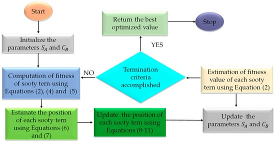 The sooty tern optimization (STO) algorithm was proposed in 2019 [,]. The algorithm is inspired by the attacking behavior of sooty tern birds. Generally, sooty terns live in groups. They employ their intelligence to locate and attack a target. The most notable characteristics of sooty terns are their migrating and assaulting behaviors. The following provide insights into sooty tern birds: