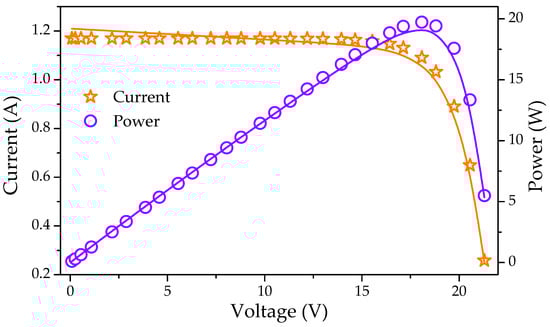 I-V and P-V characteristics curves for anticipated and experimental values for the SS2018 PV module. Symbols indicate measured data, while solid lines indicate optimized data.