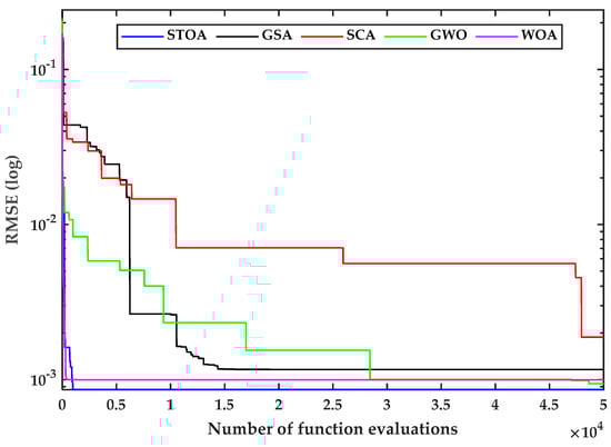This subsection offers statistical assessments of the mean, minimum, maximum, and standard deviation (SD) of RMSE for all recently created strategies. The accuracy and reliability comparison of the various algorithms in 30 runs is summarized in Table 6. The RMSE mean and standard deviation were calculated to investigate the durability of the parameter estimation algorithms. According to the statistical data presented in Table 6, the STO is found to be the most precise and trustworthy parameter optimization technique.