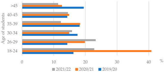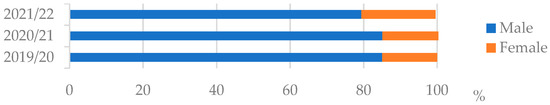 This change has affected the age of the students and also their gender. In Figure 2, the percentage distribution of males and females in this study is shown, where the percentage of women has increased from 14.94%, during the 2019/20 course, to 20.18% in 2021/22.