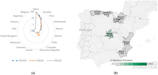 Distribution of students by location in Computer Engineering. (a) Percentage distribution during the last 3 years and (b) percentage distribution of the location of Spanish students.