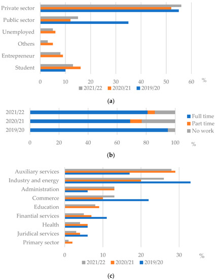 According to their professional situation, the profiles of the students are diverse. In Figure 4, an overview of the professional profile of Computer Engineering students at the Universidad Internacional de La Rioja is presented. Figure 4a shows how the majority profile of students prior to the pandemic corresponded to employed workers in private companies (56%). However, although this is the majority occupation of students, since the COVID-19 pandemic, public workers have significantly decreased and the profiles of students, unemployed, entrepreneurs, and others, such as those people who are part of companies with open government files to regulate employment, have increased. The dedication of these students to their work has also changed. In 2019, full-time workers were the majority (95%). A year later, this percentage decreased to 69% in favor of students who do not work while studying or have part-time jobs. Finally, in Figure 4c, the professional sectors of the students are shown. In 2019, students were predominantly from commerce, financial services, and industry and energy sectors. However, after the pandemic, the majority of the profiles correspond to people who work in auxiliary services and industry and energy.