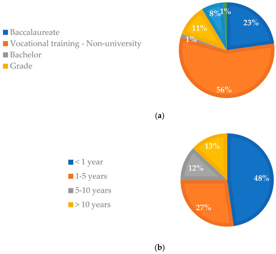 Distribution of students by educational level. (a) Educational level and (b) number of years the student has not studied before starting the course.