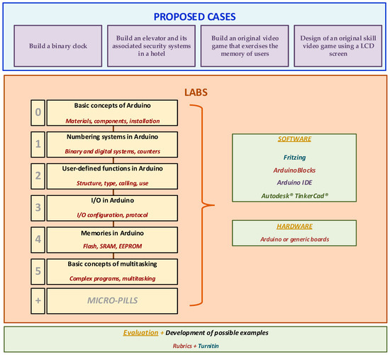 In this multicultural and complex educational context, it does not seem logical to propose a single activity closed to all students equally as part of the continuous assessment. For this reason, in this teaching case of study, shown in Figure 6, it was proposed to modify the two individual activities that students must deliver as part of their continuous assessment for project-based learning using Arduino-type hardware devices, which is a low-cost platform of free software more widespread in the world. To do this, students must choose at least two of the four proposed projects: