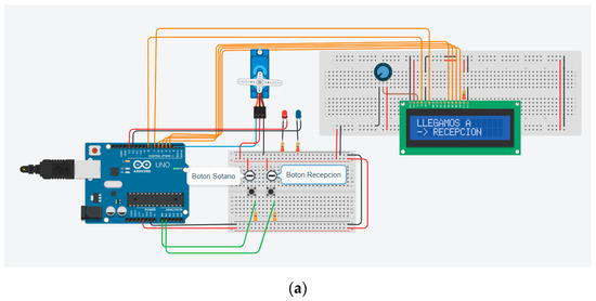 Examples shown during the development of one of the labs in (a) simulation of the project Build an elevator and its associated security systems in a hotel and (b) Build an original video game that exercises the memory of users with Arduino board.