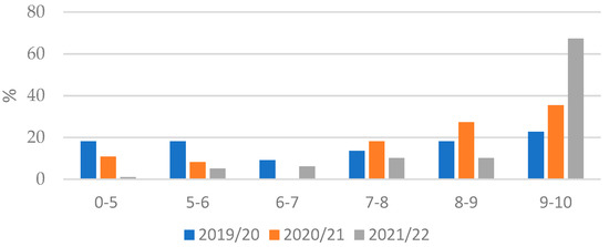The success of this academic case of study is estimated through objective data measured on the platform (student access to the live platform while the teacher gives the sessions, student participation in the sending of proposals and the marks obtained by the students), and the satisfaction surveys carried out on students after the case study. On the one hand, Table 2 shows the fundamental parameters obtained from the platform in the last three courses. Student attendance at online life sessions has grown both in average number of students (from 8.42% in 2019/20 to 59.21% in 2021/22) and in peak values (65.79% of students attended some sessions compared to 18.32% in 2020/21). Although the sessions are recorded and can be viewed at any time during the course, these values show that the students were more interested and motivated to attend the sessions presented in the face-to-face sessions and interact with the teacher live. In addition, the number of students who have delivered the project in 2021/22 is 72.37%, with participation increasing significantly compared to previous years. Although the percentage of students presented only represents a difference of 6.78 points compared to the previous year, the number of students is greater due to the increase in students who have experienced the subject. Even the quality of the works has increased because the average marks of the students have increased with respect to previous years, reaching 8.84 out of 10 maximum possible points. To complete the information on this value, Figure 9 shows the distribution of the grades obtained by the students where a greater number of grades lower than 6 can be seen in subsequent years, while in this experience, the highest number of marks obtained are in the range of 9 to 10 points out of 10 (67.35%). The latter denotes that the flexibility and personalization of the proposed projects have an impact on the students, motivating them to successfully complete the proposed activities.