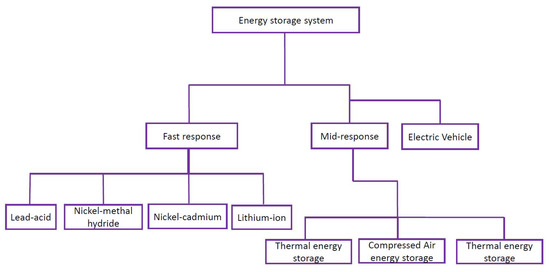 The ESS has been used to improve the flexibility of a high-VRE-power systems [131,132,133]. It can be used to mitigate imbalances in power and voltage deviations to improve the power indices [134,135]. Reference [136] has classified the flexibility capabilities of ESS based on individual responsiveness. The classification includes: a fast response, mid-response and electric vehicle, as described in Figure 4. The study of [133] improved the flexibility of coal-fired power plants using the integration of thermal energy storage (TES). This study developed a dynamic power plant model in the Dynamola simulation environment to decouple the firing rate and net rate, and the TES enables an easy initiation of the start-up process and control of power. Niu et al. [132] studied the dispatch of a building energy system using the TES and BESS. They proposed a linear model to predict dynamic cooling load while developing complexity-evaluation and accuracy-evaluation indices as criteria for selecting a building thermal model. Furthermore, this study uses MILP to develop and test the flexibility capacity of both battery and building thermal storage. The problem is formulated as an optimization problem, with the objective to minimize electricity and maintenance costs. This accounts for all supplies and loads in the building. The maintenance costs are made up of the expenses of the power subsystem and cooling subsystem, which are key components of the model because the effectiveness of the thermal storage is stochastically model around several parameters, including the behavior of the building occupants, weather parameters and other controllable parameters. Some of the parameters were constrained for the objective function together with power systems, photovoltaic and battery energy constraints. This study found that a compromise exists between flexibility enhancement and increasing investment on infrastructure. Additionally, an accurate forecast of the dynamic cooling load in buildings could potential enhance the flexibility dispatch of power using the building thermal storage.