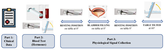 The test took place at CUH’s dysautonomia unit under the supervision of a doctor and a nurse. Twenty-four hours before the experiment, the patients signed a consent form and had their bladder emptied. Concerning the process inside the laboratory, the data collection was performed according to the same experimental protocol [22], which received the approval of the Clinical Research Committee of Basque under the PI2013132 validation code. The protocol was divided into the three stages shown in Figure 1, which will be described below.