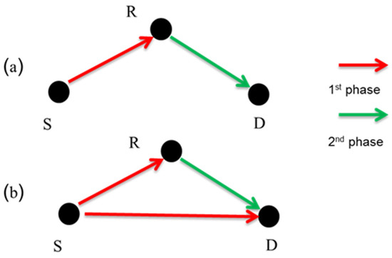 The system model without SWIPT. (a) the signal from a source to a destination through the relay; (b) the signal from a source to a destination through the relay with direct path.