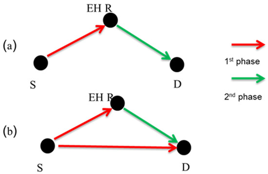 The system model with EH. (a) the signal from a source to a destination through the relay; (b) the signal from a source to a destination through the relay with direct path.