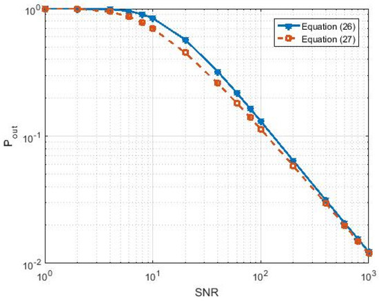 The optimal outage probability comparison of (26) and (27) with different SNR.