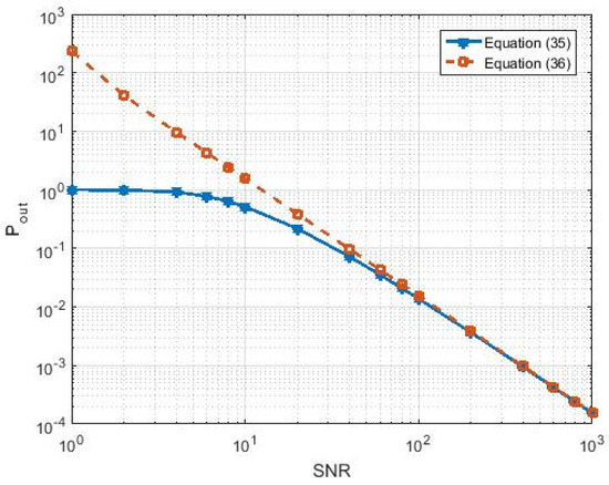 Figure 4 plots the optimal outage probability for (35) and (36) for different SNR, It can be seen from Figure 4 that the behavior of those two curves are similar when the SNR is more than 20 dB. Furthermore, Figure 4 also shows that (36) cannot be approximated to (35) when the SNR is less than 11 dB.