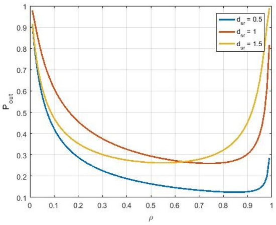In Figure 5, we show the outage probability versus power splitting factor according to (45) with different , 0.5, 1 and 1.5. It can be seen from (12) to (16) that the harvested energy increases as power splitting factor increases. However, the SNR of will decrease when power splitting factor increases. The shorter not only can offset the negative impact of using a larger power splitting factor , but also can increase the harvested energy. Therefore, It can be seen from Figure 5 that the lowest outage probability occurs when power splitting factor approaches 1 with . With the increase of , the above two advantages are no longer available. If a large power splitting factor is selected when is longer, the SNR of will be worse, and there is not enough energy for acquisition. As a result, it also can be seen from Figure 5 that the optimal power splitting factor decreases as increases.