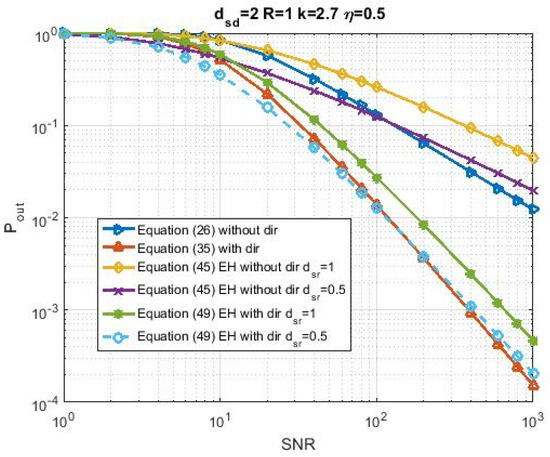 In Figure 7, we show the optimal outage probability versus SNR with six scenarios, conventional cooperative relay network without direct path, conventional cooperative relay network with direct path, cooperative relay network without direct path under SWIPT at , cooperative relay network without direct path under SWIPT at , cooperative relay network with direct path under SWIPT at and cooperative relay network with direct path under SWIPT at . We consider the above scenarios of for the case where the harvested energy is sufficient, and the scenarios of are the case that the harvested energy is insufficient. The optimal outage probability of conventional cooperative relay network in Figure 7 comes from optimal relay position and optimal power allocation under each different SNR and the optimal outage probability of cooperative relay network with SWIPT in Figure 7 comes from optimal power splitting factor under each different SNR. It can be seen from Figure 7 that cooperative relay network without direct path under SWIPT at has highest outage probability in the six scenarios for each SNR due to the distance of S-EHR is too long to harvested energy and there is no direct path assistance. Cooperative relay network without direct path under SWIPT at and conventional cooperative relay network without direct path have similar optimal outage probability at SNR of 20 dB, but as SNR increases, the optimal outage probability of Cooperative relay network without direct path under SWIPT at is slightly higher than the other. Under consideration of joining the direct path, cooperative relay network with direct path under SWIPT at which with sufficient harvested energy and conventional cooperative relay network with direct path have similar optimal outage probability.