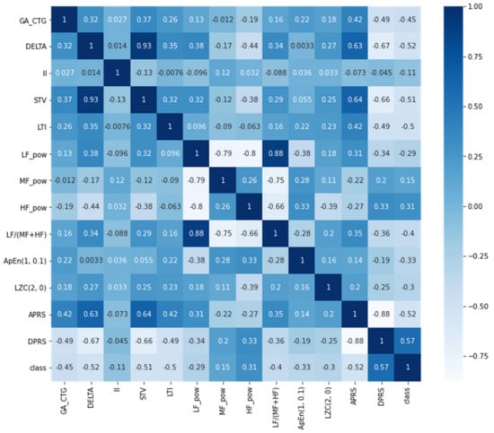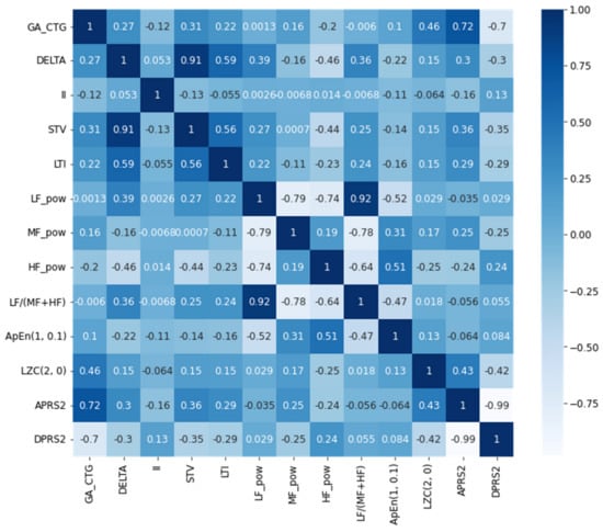 In the first dataset each model consists of 60 CTG recordings for more than 30 min obtained in various weeks of pregnancy from pregnant mothers. It has also been classified into three indexes: time, frequency and non-linear domain (i.e., Short Term Variability (STV) categorized as a time-domain parameter, ARPS as a non-linear domain parameter). The data was collected and transformed using Hewlett Packard CTG fetal monitoring (Series 1351A) and a PSD Power Spectral Density tool connected to a computer PC during the general tests for non-stress with FHR 2 Hz sampled (one value per 500 ms). The dataset contains 60 samples for IUGR and 60 for normal fetus with 13 attributes. The statistical analysis of the dataset attributes is shown in Table 1. The mean GA of the pregnant women in the dataset is 33.7 week, while the minimum GA is 28 and the maximum is 39. The delta attribute indicates the heart rate of the fetus per minute. In the dataset I, the mean delta is 36.6. The inter quartile range of the total heart rate of the fetus in 3 min window size is represented by the interval Index (II) attribute. However, FHR variability was monitored in the smallest window size of 1 min and is represented in the dataset as STV. Furthermore, the FHR frequency was further normalized into three ranges (low frequency (LF), mid frequency (MF) and high frequency (HF)) using z-scale normalization. These features were used to monitor and analyze the heart rate variability. Approximate entropy (ApEn) was used to predict the uncertainty and irregularities in the CTG data. This is one of the statistical measures used to analyze irregularities in time series data. In addition, LZC attribute used the Lampel and Ziv method to analyze the time series data in terms of complexity by finding the number of unique patterns and the repetition of those patterns in the time series data. Finally, the acceleration phase rectified slope and deceleration phase rectified slope were extracted. The correlation of the attributes with the target variable is shown in the Figure 1.