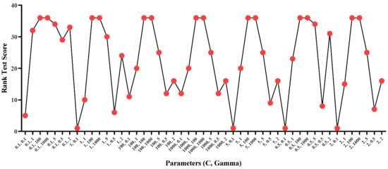 Support Vector Machine (SVM) algorithm is one of the most widely used classification and regression algorithms. SVM uses a maximum margin concept to categorize the data into different labels. The classifier aims to build a maximum optimal hyperplane. An optimal hyperplane is a line that has the maximum margin between the vectors of the two classes. However, sometimes the data in not linearly separable; therefore, different kernel function is used to convert the non-linearly separable data into linearly separable. SVM has the capacity to perform better with the high dimension datasets. In this study, a “linear” kernel was used. The SVM model contains a huge number of parameter and an optimal selection of these parameters greatly enhances the performance of the algorithm []. Therefore, Grid search optimization technique was used. Grid search was applied on the “C” and “Gamma” parameters using the selected features. Moreover, Figure 2 indicates the rank test score results of the model with grid search on C and Gamma parameters and provides the best rank value = 1 with those value pairs of parameters (C = 1, Gamma = 0.1), (C = 5, Gamma = 0.1), (C = 0.5, Gamma = 0.1), and (C = 2, Gamma = 0.1). Finally, C = 1 and Gamma = 0.1 were selected for model training.