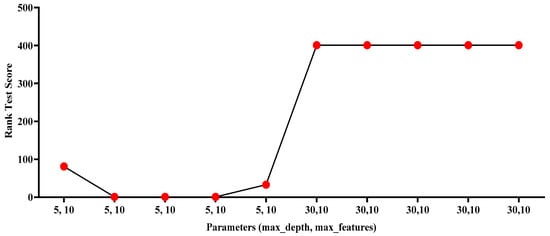 In the above equation, (x) represents the input vector and represents the classification result by a decision tree for (x). One of the key benefits of RF is its ability to handle large datasets with a high number of features and records []. Similar to SVM, Grid search optimization was applied to the parameters, such as the number of estimators, the maximum depth, the minimum samples split, the minimum samples leaf and the maximum features parameters. As shown in Figure 4, the Rank Test Score results of applying grid search to the parameters has given the best rank value = 1 with the following pairs (n_estimators = 300, max_depth = 5, min_samples_split = 2, min_samples_leaf = 1, max_features = 10), (n_estimators = 500, max_depth = 5, min_samples_split = 2, min_samples_leaf = 1, max_features = 10) and (n_estimators = 800, max_depth = 5, min_samples_split = 2, min_samples_leaf = 1, max_features = 10). Finally, (n_estimators = 300, max_depth = 5, min_samples_split = 2, min_samples_leaf = 1, max_features = 10). Table 4 indicates optimal parameters for RF.