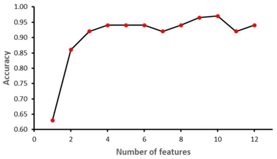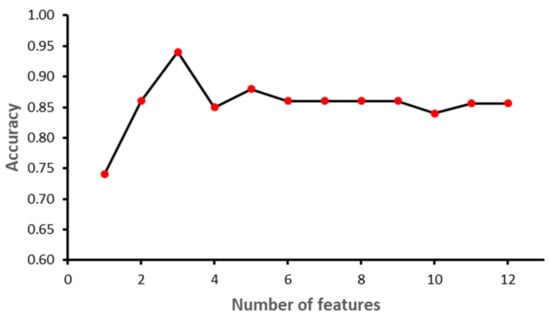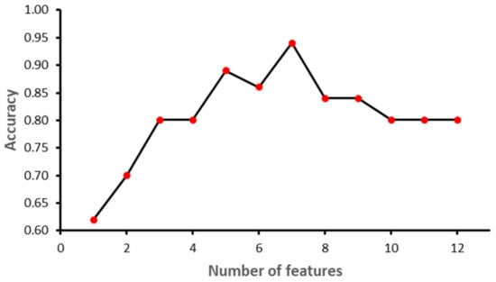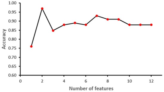 The study was implemented in Python 3.8.9. Sklearn library ver. 0.23.2 was used to implement ML models. Other libraries included NumPy ver. 1.18.5, Pandas ver. 1.3.3, matplotlib ver. 3.3.1 and Dalex ver. 1.4.1. The dataset was partitioned into training and testing using 70–30 distribution. A normalization technique was applied to SVM, since it is a linear-based model, to make it normally distributed in a standard scaler. Furthermore, a Recursive Feature Elimination (RFE) feature selection technique was applied while grid search and cross-validation were performed to find the best values for each algorithm parameter. Figure 6, Figure 7, Figure 8 and Figure 9 show the outcome of the RFE for each classifier. Figure 6 shows that with seven features, while the SVM model achieved the highest performance in terms of accuracy. Initially, the performance of the model improved with the increase in the number of features, but with eight features the performance deteriorated. The selected features for SVM model were: ‘II’, ‘STV’, ‘LTI’, ‘MF_pow’, ‘HF_pow’, ‘LF/(MF + HF)’ and ‘ApEn(1, 0)’. However, for the RF model, the best performance was achieved with 10 features: ‘GA_CTG’, ‘DELTA’, ‘STV’, ‘LTI’, ‘LF_pow’, ‘HF_pow’, ‘LF/(MF + HF)’, ‘ApEn(1, 0.1)’, ‘LZC(2, 0)’ and ‘APRS’. Figure 7 shows the impact of feature selection on the performance of the RF model. The performance of the RF algorithm initially increased as the features were added, but after six features the performance degraded slightly; however, by eight features the performance start to increase again. Similarly, KNN achieved the best performance with two features, namely GA_CTG’ and ’LZC (2,0), as shown in the Figure 8. Finally, the GB model produced the best performance with three features: ‘GA_CTG’, ‘STV’ and ‘LTI’, as shown in Figure 9. Table 6 contains the selected features using RFE for each classifier.