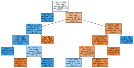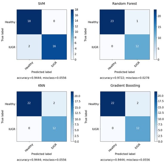 In addition, Signorini et al. [] used several ML techniques such as Random Forest (RF), Classification Trees (CT), Logistic Regression (LR) and SVM for antepartum fetal monitoring and detected the pathology during pregnancy using physiology-based heart rate features. The dataset consisted of 60 IUGR and 60 healthy fetus and had time, frequency and non-linear parameters. Similarly, the models were trained with 11 cardiac rate features extracted from prenatal Cardiotocographic (CTG) recording. They found that RF and CT achieved the greatest accuracy (0.911).