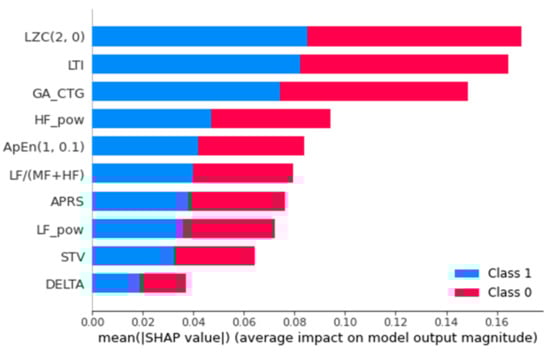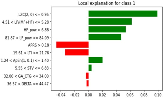 The studies have shown the significance of ML in monitoring fetus health during the gestation period [,,]. Furthermore, as there are different approaches in interpreting FHR, cardiotocography is widely implemented in hospitals to provide fetal monitoring. However, some studies have been conducted for antepartum fetal monitoring using fetal heart rate data. The studies have achieved good results but can be further improved and investigated using other ML algorithms. Furthermore, there is a need to find the most significant features that can help in the early prediction of IUGR fetus. Therefore, in this study, we aimed to develop a model with enhanced performance and that would reduce the number of features for monitoring fetal health. Moreover, EAI was used to enhance the interpretability of the ML models, to generate confidence in the prediction, to add to comprehensibility and to help doctors in their decision-making. To the best of our knowledge, EAI techniques have never been used to predict IUGR before.