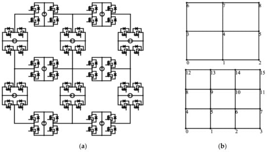 Figure 1a shows an example of the wiring diagram of a simple 3 × 3 latice converter, with each submodule being an H-bridge converter powered with a DC voltage source. Figure 1b shows the schematics of 3 × 3 and 4 × 4 grid lattice converter examples, where the numbered points are denoted as nodes and the lines connecting nodes are edges, which, in general, can be H-bridges, symmetrical half-bridges, asymmetrical half-bridges, or the other submodules in [1]. In this article, all edges are considered H-bridges to offer the most control freedom, since they can execute one of the four functions: raise the voltage, lower the voltage, keep the voltage unchanged, or bypass the edge. Through the combination of individual H-bridge controls (which will be explained in more detail in Section 2), the lattice converter as a whole can output different voltages.
