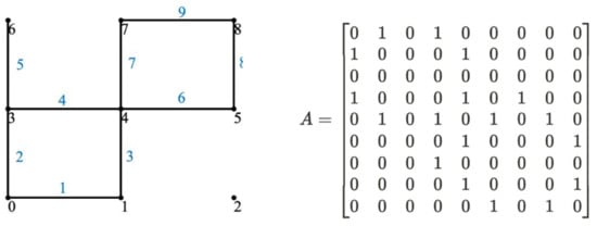 With the help of the adjacency matrix, it is possible to find paths that electrical currents go through when traveling across the lattice converter. Given a pair of starting and destination nodes, such paths can be extracted and represented as a sequence of nodes through which currents travel. In Figure 3, for example, a path starting from node 0 and ending at node 8 can be [0, 1, 4, 5, 8]. This path is reflected in the adjacency matrix by the elements (1, 2), (2, 5), (5, 6), (6, 9), being one.
