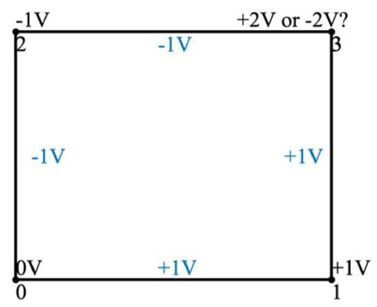 Node voltage solutions are a set of voltages assigned to each node of the lattice converter. They are sufficient to fully determine the state of each edge and provide unique control algorithms. There are three conditions that node voltages must follow: (1) the voltage at the starting node is 0 V, (2) the voltage at the destination node is the desired output voltage, and (3) the voltage difference between any two connected neighboring nodes can only be +1, −1, or 0 given the four functions of H-bridges. Satisfying these conditions and with the specific voltage at each node, a lattice converter can be completely defined.