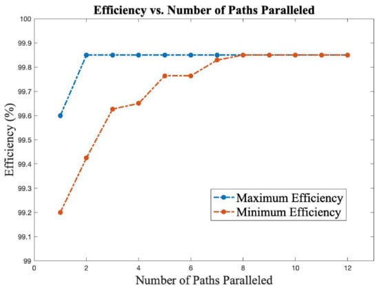 Maximum and minimum efficiencies for given number of paths paralleled for 3 × 3 lattice converter.