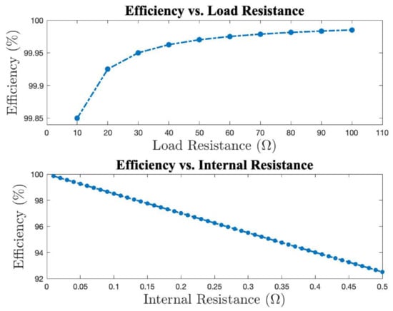 While all previous efficiency data are based on output voltage of 3 (3 × 3) or 5 (4 × 4), load resistance of 10 Ω, internal resistance of 0.01 Ω for each edge, and 1 voltage source for each edge, these conditions can vary, and we should examine the effect of such variations to the efficiencies of the lattice graphs. Analyses show that neither output voltage nor converter voltage affects converter efficiency, while both load and internal resistances affect it. The first subplot of Figure 11 shows the efficiency of the lattice converter shown in Figure 7 raising with a slowing rate as the load resistance increases. The second subplot of Figure 11 shows a reverse trend of efficiency decreasing (almost linearly) as internal resistance increases. Both trends are straightforward in showing that a larger difference between load resistance and internal resistance (when the difference remains positive) would result in higher efficiency.