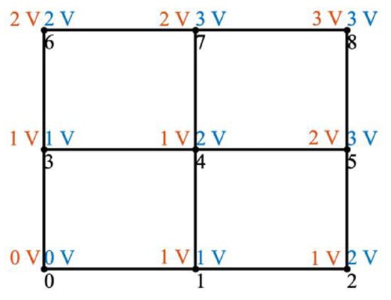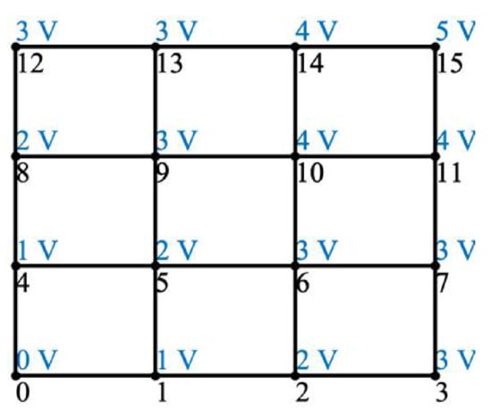Given the most efficient graphs and a desired output voltage, there are a number of possibilities for node voltage solutions. For example, there are 18 different solutions to the most efficient 3 × 3 lattice graph shown in Figure 7 with output voltage of 3, two of which are shown in Figure 12 with different colors representing different control strategies. Similarly, there are 144 solutions to the most efficient 4 × 4 lattice shown in Figure 10 with output voltage 5, one of which is shown in Figure 13. Each of these graphs finalizes the control actions taken at each edge, providing a complete control strategy for the lattice converter.