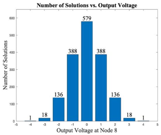The total number of solutions depends on both lattice converter topology and output voltage. For the most efficient topologies shown in Figure 7 and Figure 10, the maximum output voltage can be ±4, ±6, respectively. As the absolute value of the output voltage approaches the maximum, the number of possible node voltage solutions drops rapidly. Figure 14 shows such a trend for the example of a 3 × 3 lattice converter.