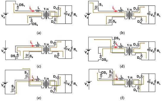 Lineal subcircuits of operation of SAB converter in CCM. (a) Interval (t0, t1), (b) interval (t1, t2), (c) interval (t2, t3), (d) interval (t3, t4), (e) interval (t4, t5) and (f) interval (t5, t6).
