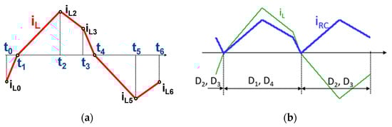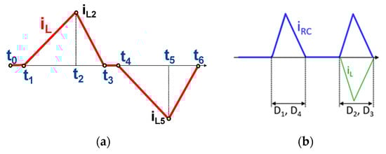 The operation mode in which the current passing through the inductor reaches zero in the intervals, (t2, t3) and (t5, t6), is called discontinuous continuous mode (DCM). If this occurs, the current remains zero until the end of these intervals. In this case, some of the equations for CCM must be modified. Thus, Equations (1) and (7) for CCM become, in both cases: