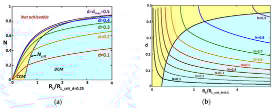 The information provided by Figure 6a is very important for understanding the operation of the SAB converter, but it is especially useful to have an idea of the closed-loop operation of the converter, that is, when a feedback loop ensures a given voltage conversion ratio at full load and the value of RL is gradually increased. Under these conditions, the duty cycle of the converter will decrease, which can be seen in Figure 6b. The normalized voltage conversion ratio, N, has been used as a parameter. The duty cycle at the boundary of the two conduction modes, dcrit, is the value shown in (26).
