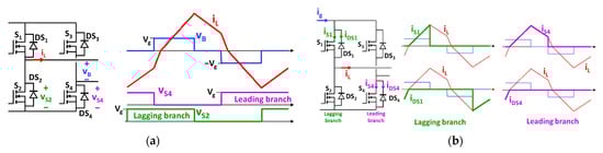 As an example, an operation point has been chosen in CCM. Figure 7a shows the voltages at the midpoints of the two branches of the bridge (vS2 and vS4). The phase-shift between them generates the vB waveform, which is the voltage between those midpoints. Looking at the voltages, vS2 and vS4, it is clear that vS2 is delayed from vS4; thus, the branch where vS2 is measured is called the “lagging branch”, and the other branch is called the “leading branch”.