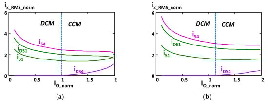 In Figure 8a, normalized rms values of the current through the semiconductors are shown for the maximum voltage conversion ratio (N = Nmax), while in Figure 8b, the voltages are changed to obtain a N = 0.8·Nmax.