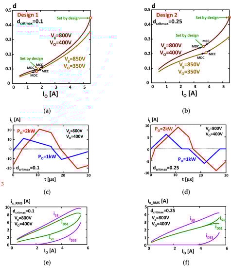 In Figure 10a,b, the evolution of the duty cycle depending on the output current is shown when the converter works in closed loop for both designs. These curves are obtained as in Figure 6b, i.e., from Equations (19) and (23) and by clearing the value of d in them. The difference is that the independent variable is in this case IO = VO/RL instead of RL. It can be observed that choosing dcritmax = 0.1 (Design 1), the converter operates in CCM for most of the IO variation range. This is attractive for reducing switching losses, but it penalizes conduction losses. In Design 2 (dcritmax = 0.25), since the converter works in DCM for most IO values, conduction losses are reduced while switching losses are penalized. In Figure 10c,d, the waveforms corresponding to VO = 400 V, Vg = 800 V and two output power levels are shown. Comparing the two figures, the current values in the second design are lower than in the first. The same pattern can be seen in more detail in Figure 10e,f, which show the rms values of the current passing through the transistors and anti-parallel diodes of the leading branch (taking as an example S3 and DS3) and the lagging branch (taking as an example S1 and DS1). Considering the scales of the figures it is clear the conduction losses are lower in the second design.