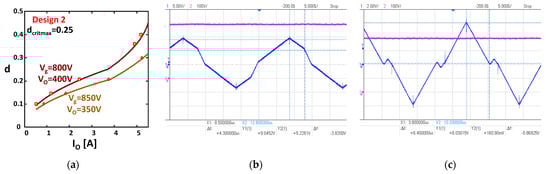 Experimental results using Design 2 (dcritmax = 0.25, n = 1, and L= 407 uH), Vg = 800 V and VO = 400 V. (a) Experimentally measured output current for different duty cycles. Inductor current (blue) and output voltage (violet) in (b) CCM at 2 kW (d = 0.36) and (c) DCM at 1 kW (d = 0.206).