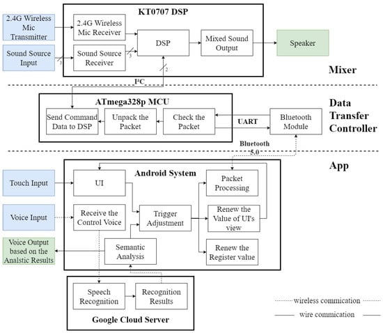 The proposed development platform provides remote audio control and speech recognition, which can connect the applications (APP) on mobile phones and the mixer via Bluetooth, so the sound engineer can walk around in front of the stage for testing. The sound engineer can adjust and change the parameters of setting in time to achieve the best output of audio. The proposed smart system platform used in this article is a prototype design to integrate various modules. The DSP kernel of the mixer is KT0707 [9], and the micro control unit (MCU) kernel of DTC is implemented by Atmeaga328p [10]. The self-developed APP using the library of SpeechRecognizer [11] combines speech recognition and remote-control technologies, which allows us to upload the speech to the Google cloud server, and then this service returns the string data. It yields the maximized accuracy of speech control on the APP.