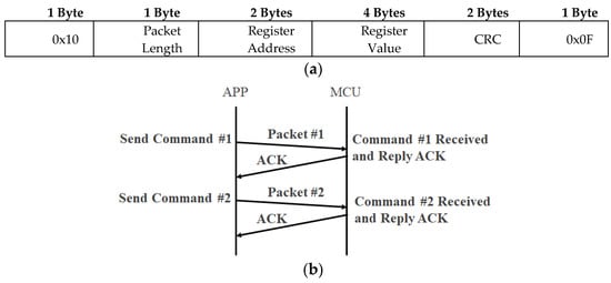Figure 4a represents the format of SBPF with a length of 11 bytes. One byte is used for the left edge of the block, another byte is used for the packet length. Two bytes are used for storing the register address, and four bytes are used for storing the register value. Another two bytes are used for CRC, and the last byte is used for the right edge of the block. In addition, the proposed SBPF adopts CRC (CRC-16-CCITT) [20] and ACK mechanisms to improve the accuracy and integrity of the transmitted data. Figure 4b provides further descriptions of the communication protocol. An MCU is employed as a slave terminal, and the proposed APP is the master terminal. In practice, a specific library is created to control the proposed SBPF. There are three main functions in the library, i.e., “General_Tx”, “General_Rx”, and “Interrupt_Process”, are all are used for processing with the following actions: (1) packaging and scheduling, (2) received data filtering and identifying, and (3) time scheduling and retransmission mechanism. To confirm the integrity of packet transmission, an ACK mechanism is deployed in the proposed design. If the ACK is successfully received by the MCU, it indicates that the current packet has been correctly transmitted; if it fails, the current packet will be retransmitted again. However, if the maximum amount of retransmission times is exceeded, the current packet is ignored in order to prevent delaying subsequent packets.