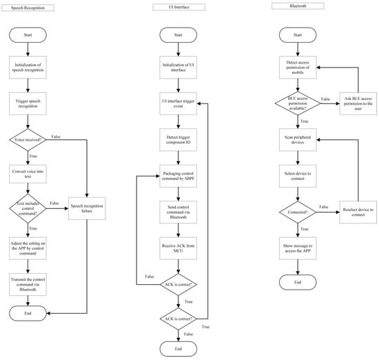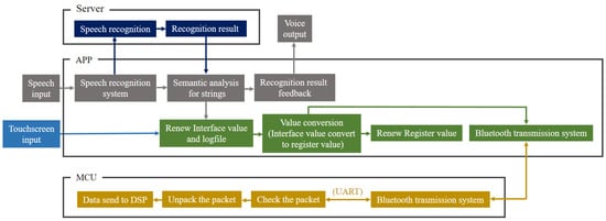 APP design is the core of the proposed system. The complete APP functional block diagram is shown in Figure 5. As multi-thread technology is employed in APP, the UI interaction and speech recognition can be executed simultaneously. Different from the MCU, single thread technology only can execute single events to prevent memory conflicts. Except for the above-mentioned functions, the Bluetooth transmission protocol adopts Bluetooth low energy (BLE) technology in the APP to program the connection and transmission functions. It can reduce the communication delay of MCU and the consumption of the smart system platform. In addition, the proposed APP includes functions of speech recognition, semantic analysis, and the storage of DSP instruction sets.