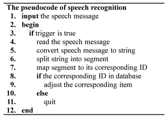 In this work, speech recognition technology provided on the Android platform by Google SpeechRecognizer [21], which is employed to realize the function of speech control. This provides the functions to convert speech into text with a high accuracy. Additionally, it has the advantage of being able to be executed in various noisy environments. The recognized control command will be converted into text. The function and the scale in the text will be analyzed by semantic analysis, then the packets will be transmitted by DSP to tune the mixer. For example, if the recognized control command is “turn on the volume”, it will be recognized that the volume needs to be tuned and the switch will be turned on. The pseudo code of speech recognition is shown in Figure 6.