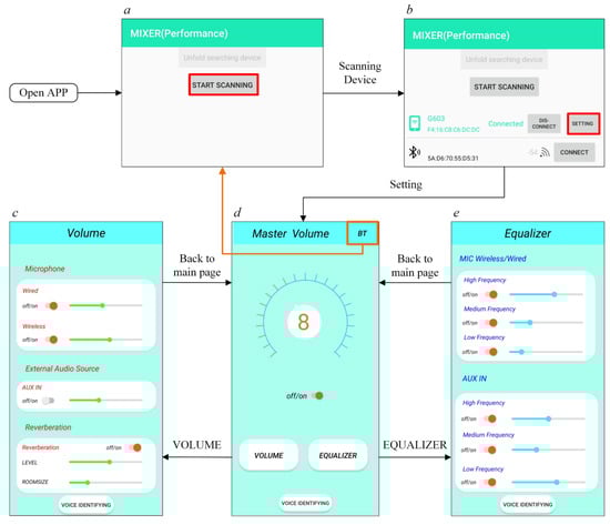 For the interface of the APP, ConstraintLayout [22] provided by the Android platform is used as the base layout method. The operation process of the APP is introduced in Figure 8. The initial screen of the interface is shown in Figure 8a. Bluetooth scanning will be activated when the button “start scanning” is pressed. All the devices that can be connected will be shown in the list. Once the Bluetooth device is connected, then a screen will be shown, as in Figure 8b. Press the “setting” button to enter the main screen of the control functions. The main control screen is shown in Figure 8d. The tuning button of the main volume is located in the middle of the screen. The volume control screen is shown in Figure 8c. The slider bar is used to control the volume adjustment of the wired/wireless microphone, external sound source volume, reverberation level, and the room size. The equalizer control screen is shown in Figure 8e. The slider bar is used to control the gain of the high, medium, and low frequency band for the frequency response of the input audio. The hardware framework of the proposed system is demonstrated in Figure 9. The user can manipulate the mixer system on the APP. Once the devices are connected via Bluetooth, audio tuning can be executed sing voice control or touch control. The proposed design improves the drawbacks of the traditional audio mixer system to a smart system with intuitive operation and rapid response.