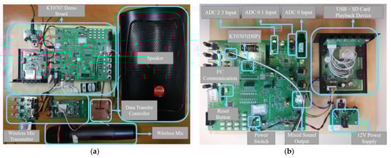 The actual prototype design of the proposed system: (a) complete hardware and (b) KT0707 demo board.