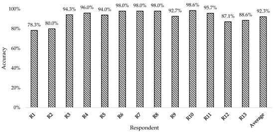 To verify the accuracy of speech recognition on the APP, 14 control commands of speech were created in the proposed system. The 13 eligible respondents (R1–R13) whose ages were between 20 and 30 were invited to test the speech recognition function. Every control command was tested at least three to five times. The total tests reached 770 times. The testing environments were set up in office and band rehearsal studios. The test result is shown in Figure 10. The accuracy reached 90% of nine respondents. The average accuracy of all respondents reached 92.3%. The result revealed that the accuracy of speech recognition achieved excellent results, even though the testing environment had ambient noise.