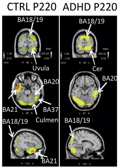 - Leroy, A.; Petit, G.; Zarka, D.; Cebolla, A.; Palmero-Soler, E.; Strul, J.; Dan, B.; Verbanck, P.; Cheron, G. EEG Dynamics and Neural Generators in Implicit Navigational Image Processing in Adults with ADHD. Neuroscience 2018, 373, 92–105. [Google Scholar] [CrossRef] [PubMed]