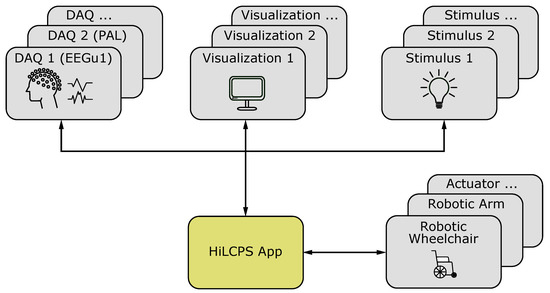 Typical structure of an application built with the HiLCPS framework [68]. The four different device types, digital acquisition (DAQ), visualization, stimulus, and actuators, can be seen.