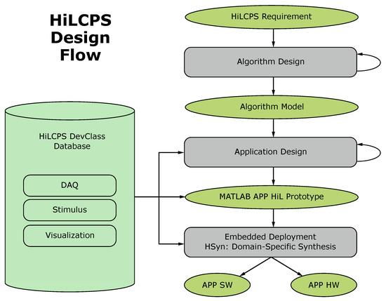 Figure 3 illustrates the recommended workflow when using the HiLCPS framework. It consists of three main stages. During Algorithm Design, the designer can utilize the full extent of the MATLAB environment to compile the desired algorithm. In the Application Design stage, the algorithm is embedded in a software application that ties inputs from multiple sensors and outputs to actors/visualization elements together. HiLCPS DevClasses are instantiated here and can be prototyped through the MATLAB HiL mechanism. Eventually, the application is deployed to the target systems in the Embedded Deployment step. HSyn allows the automatization of this step, so developers do not have to manually map the algorithms to the specific hardware. By doing so, the authors claim that a productivity gain (i.e., development time decrease) of six orders of magnitude can be achieved.
